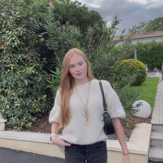 Pull sans manches. Composition : 30% mohair, 20% polyacrylique, 10% laine et 40% polyamide. Idéal pour soirée d’été. Touche cosy et chic. Fabriqué en Italie.